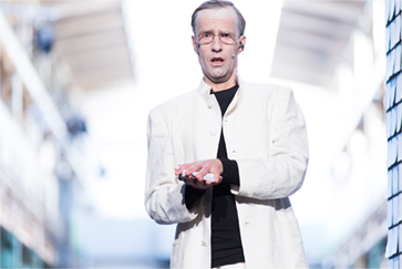 Zunächst einmal muss ich gestehen, dass mir diese Vorgeschichte in ihrer Ausführlichkeit nicht bekannt war. Aber natürlich ist der Blick in die Zukunft, das Gestalten einer Zukunft als schöpferischer Akt, das große Thema der Oper. Auch in unserer szenischen Interpretation ist es der Mann, der sich in die fiktive Welt der “Entfrorenen Zukunft“ begibt, in dem er zunächst eine Welt von Kältekammern entwirft, in denen Menschen eingefroren werden, um nach einer bestimmten Zeit wiederzuerwachen, aufzubrechen in ein Leben, das dann durch ein Wiedereinfrieren abermals unterbrochen wird. Ein ständiger Kreislauf, ein Streben ohne Sinn, Gleichförmigkeit statt Einzigartigkeit. „Dieses Kreisen ohne Ziel wird uns keine Zukunft schenken“, wie es im Libretto heißt. In seiner Fantasie gelingt es dem Mann diesen Mechanismus zu durchbrechen – und er ist nicht der einzige: Er trifft eine Frau, träumt von der großen Liebe und imaginiert eine romantische Liebesnacht, aus der ein Kind hervorgeht. Für mich geht es darum, eben diese Geschichte zu erzählen, denn sie ist vor allem eines: menschlich. Es geht um menschliche Grundbedürfnisse wie den Drang frei entscheiden und selbstbestimmt handeln zu können und sich dabei immerwährend auseinanderzusetzen mit dem Gegenüber, der Gesellschaft, der Welt, aber auch um die große Sehnsucht nach Liebe, nach Geborgensein, nach Körperlichkeit, die im Liebesakt ihre vollkommenste Erfüllung findet. Die “neuen Füße“, die Du ansprichst, betreffen nur das auslösende Moment der Geschichte: Warum überhaupt flüchtet der Protagonist in eine Fantasiewelt (in der er, wie sich herausstellen wird, vielmehr er selbst sein kann als in der “Realität“)? Ich habe mich gefragt, woher kommt das Gefühl der Gleichförmigkeit, der Fremdbestimmtheit, das dieser Mann unbedingt überwinden will. Die Antwort drängte sich förmlich auf: aus dem Arbeitsalltag. Daher habe ich mich entschieden, diese Geschichte “am Arbeitsplatz“ zu erzählen. Dieser Mann definiert sich ausschließlich über seinen Beruf, wir wissen nicht, ob er sein Büro jemals verlässt, er scheint an diesem Ort verwurzelt zu sein. Ein Leitspruch der Firma könnte lauten: „Wer in der Arbeit versagt, dem gelingt auch in der Liebe nichts.“ Man spürt den Druck der Leistungsgesellschaft, der wir ja alle, in welcher Form auch immer, ausgesetzt sind. Da ist es jedem nur zu wünschen, dass sich eines Tages die Fantasie Bahn bricht.