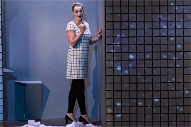 Herr Scartazzini spricht hier einen wichtigen Punkt an. Neben der Vorgabe, dass die instrumentale Partitur per Computer gesteuert wird und digital erklingt, gehören auch die von Konstantin Gaßmann gestalteten Videoanimationen zum festen Bestandteil der Oper. Die Sänger nehmen darauf Bezug und entwickeln auf der Grundlage dieser Bilder ihre Geschichte: Beamer-Projektionen als Illustrierung des Gesagten. Das ist allerdings kein dramatischer sondern ein epischer Vorgang: Die Sänger verkörpern keine Figuren, sondern beschreiben sie nur, die Animationen schaffen keinen Raum, in dem sich die Figuren bewegen könnten, sondern verweisen nur auf ihn. Es bleibt die Distanz des Sängers zu seiner Rolle. Die Herausforderung besteht nun darin, dieses „beschreiben“, das „Sprechen über“ in eine musikdramatische Handlung, in eine unmittelbare Aktion zu überführen. Das gelingt, indem man den (Denk)-Prozess des Erfindens der Geschichte sowie des In-Kontakt-Tretens als weitere Ebene miteinbezieht, denn das ist ein performativer Akt, der auf der Bühne darstellbar ist. Wir erleben also, wie der Mann in einer Art Chat einer Frau begegnet, welche Missverständnisse diese Kommunikation (die eben über den Austausch der Videoanimationen funktioniert) beinhaltet und wie sie damit umgehen; wie beide schließlich in der Geschichte über eine “Entfrorene Zukunft“ zusammenfinden.